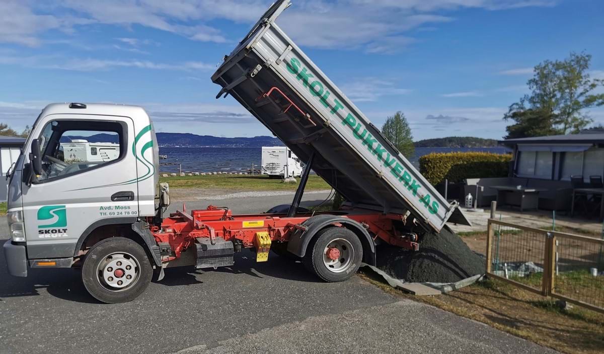 Vanligste leveransemåte er lastebil som tipper lasset på best mulig måte der du skal ha det. Lastebilene er av forskjellig størrelse, så maks last varierer noe. De fleste biler vi benytter laster ca 10 tonn. Når du bestiller, vil systemet fange opp hvilken bil som er tilgjengelig i ditt område.